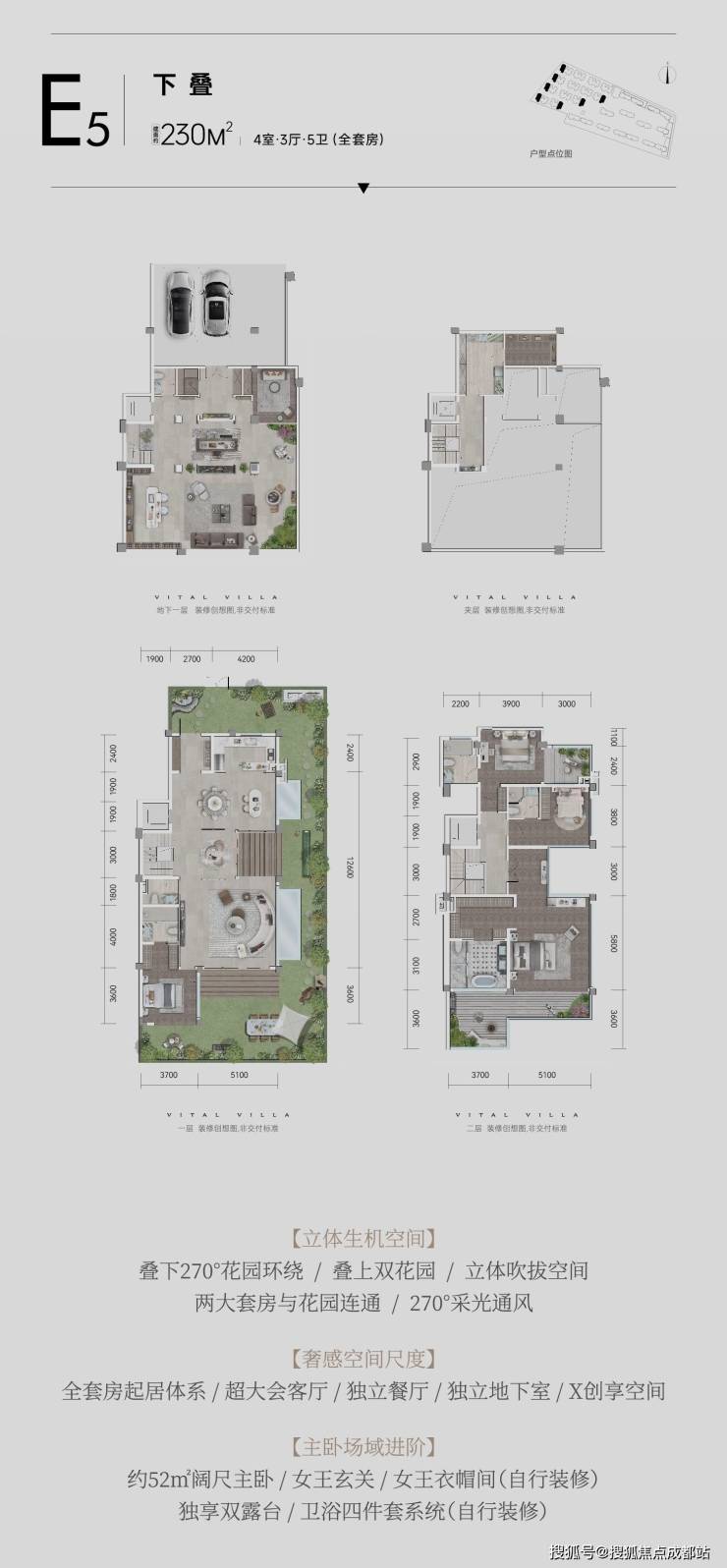建面199-235㎡叠拼别墅(高端改善优选):总价700-990万元,即将加推221㎡热门户型;首创“五独立体系”,独立建筑单元、地下室、庭院、电梯及花园动线,彻底规避邻里干扰,实现叠墅独栋化体验;部分户型可灵活改造,适配家族聚居、高端社交等多元场景。