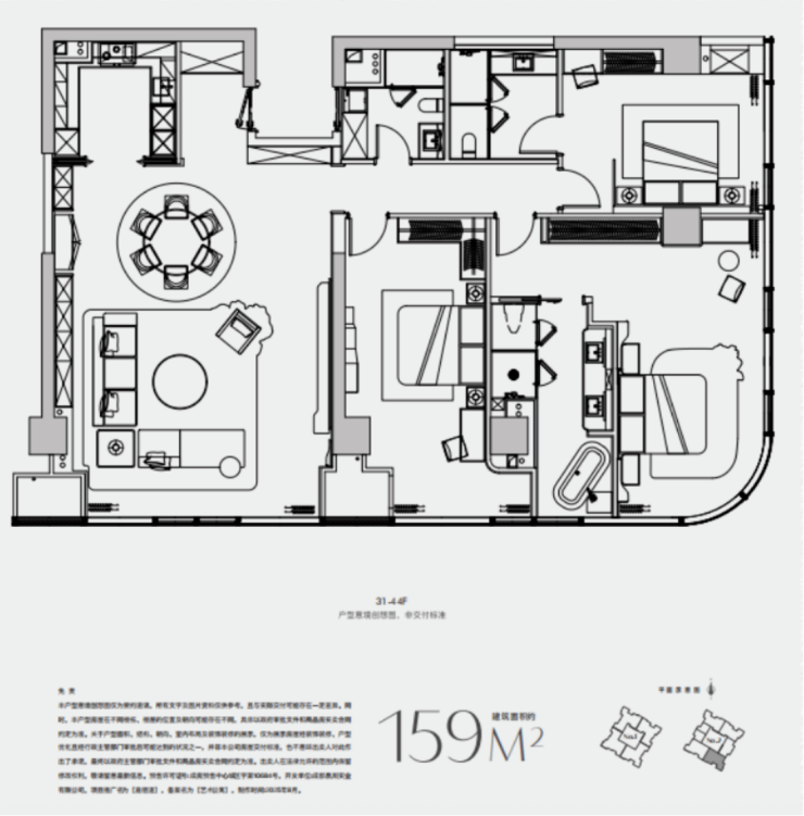 D户型:159㎡/三室两厅一厨三卫D户型同样处于东南角端户,不过楼层更高。主卧套房位于端户位置,拥有270度视野,每一个角度都如流动的画卷。朝东方向,业主睁眼就能欣赏日出,让每个清晨都充满值得珍藏的仪式感。朝南方向,则能将锦江、望江公园和川大的美景尽收眼底,楼下江畔游船往来,自然与人文相互交融,勾勒出城中独有的诗意画卷。此户型的室内设计提取中东地区的传统民族图案,以及非洲和中东地区的大地色彩、动物色彩,巧妙组合排列各种几何形状与动植物元素,形成强烈对比,营造出浓郁的异域情调,打造出独特前卫的女王之家。室内摆件出自Fornasetti和Seletti两个艺术品牌,整体视觉效果鲜明、个性,气场强大。
