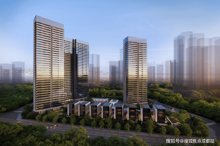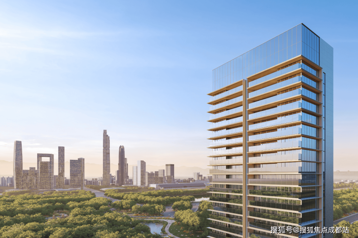 采用玻璃、铝板与石材、陶板的全幕墙体系,结合视觉黄金比例设计,以极简的线条和优雅的配色营造城市公共艺术感,打造出高端公建化的立面效果,与周边489米超塔地标及天府公园形成视觉呼应。