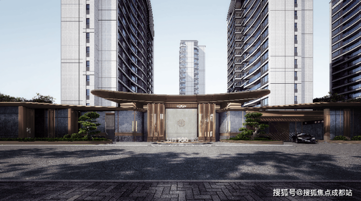 主入口设计 百米尺度主入口采用花瓣形态飞檐设计,星河灰大理石与金属材质碰撞,营造尊贵归家体验。