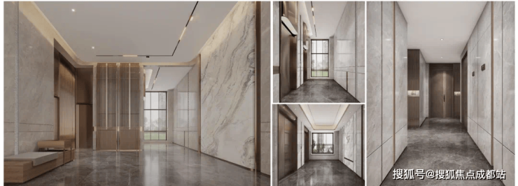 延续主入口设计语言,运用石材与暖色金属材质,营造温馨归家动线。