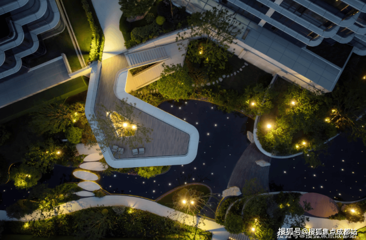 翡翠岛的产品力,不仅在于室内,更在于其对整个社区环境的系统性塑造。项目占地约37亩,容积率仅约1.8,并通过峡谷水系与已交付的鹿溪源组团串联,共同构成约320亩的滨水大盘。
