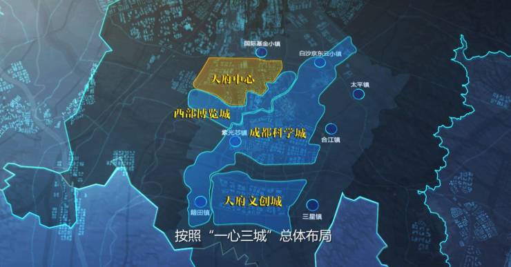 3、规划一中心三城:一中心指的是天府总部商务区(天府中心),三城分别指的是西部博览城、成都科学城和天府文创城,以产业、生态、宜居三大价值驱动城市发展
