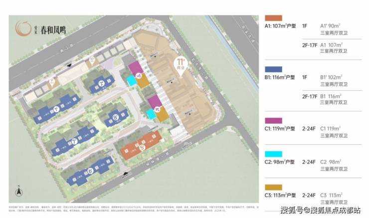项目产品:纯三房产品,1#2#6#8#(116面积)5#(107面积)2T2小高层17F:107-116㎡