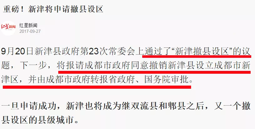 2017年9月20日,新津县政府第23次常委会上通过了“新津撤县设区”的议题,下一步,将报请成都市政府同意撤销新津县设立成都市新津区,并由成都市政府转报省政府、国务院审批。