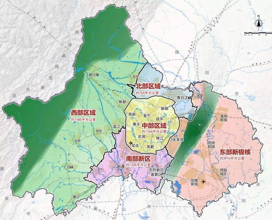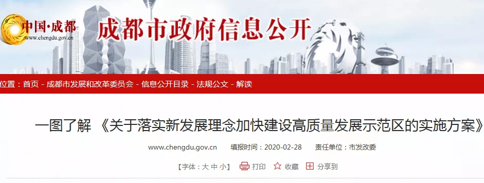 在2020年2月28日,成都市出台《关于落实新发展理念加快建设高质量发展示范区的实施方案》,将在5个区(市)县范围内形成“一源双核四带”生产力布局。