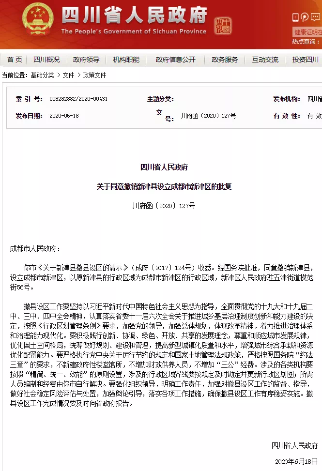 6月18日,四川省政府官网发布《关于同意撤销新津县设立成都市新津区的批复》,经批准,同意撤销新津县,设立成都市新津区,以原新津县的行政区域为成都市新津区的行政区域,新津区人民政府驻五津街道模范街56号。