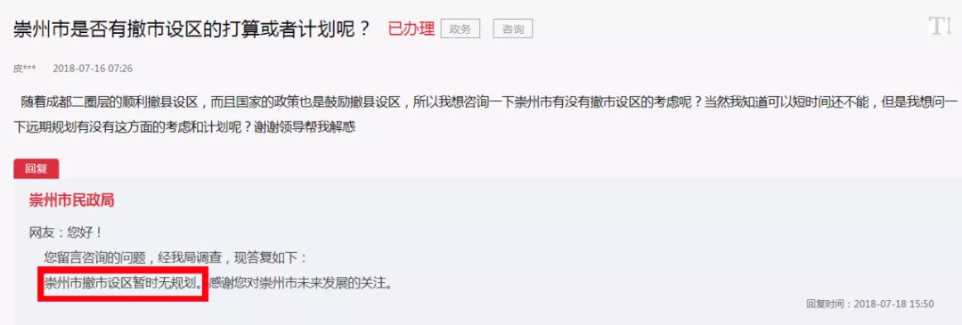对于彭州市“撤市设区”这个问题,有彭州市民在网上留言,彭州市民政局是这么答复的:撤市设区须逐级上报审批。彭州市一直积极与成都市民政部门对接,主动汇报沟通,争取支持。