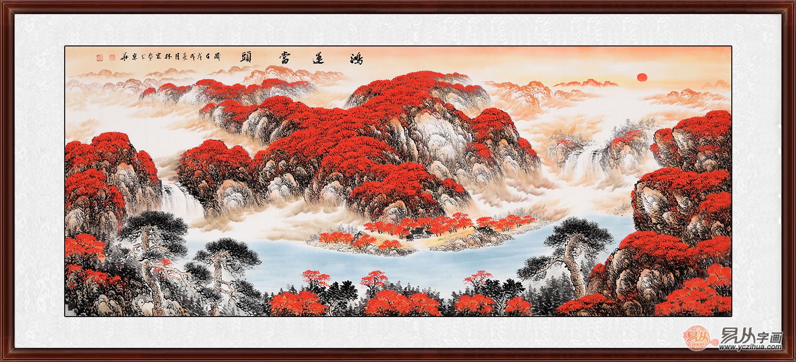 李林宏老师的这幅山水画《鸿运当头》以红色为主色调,涂然高峰与白云,让这山间充满一种喜庆之感,画中危峰耸立,山水环绕,红云蒸腾,红光万里,有好事不断,好运不断之寓意,山下潭深水清,水面非常平静。