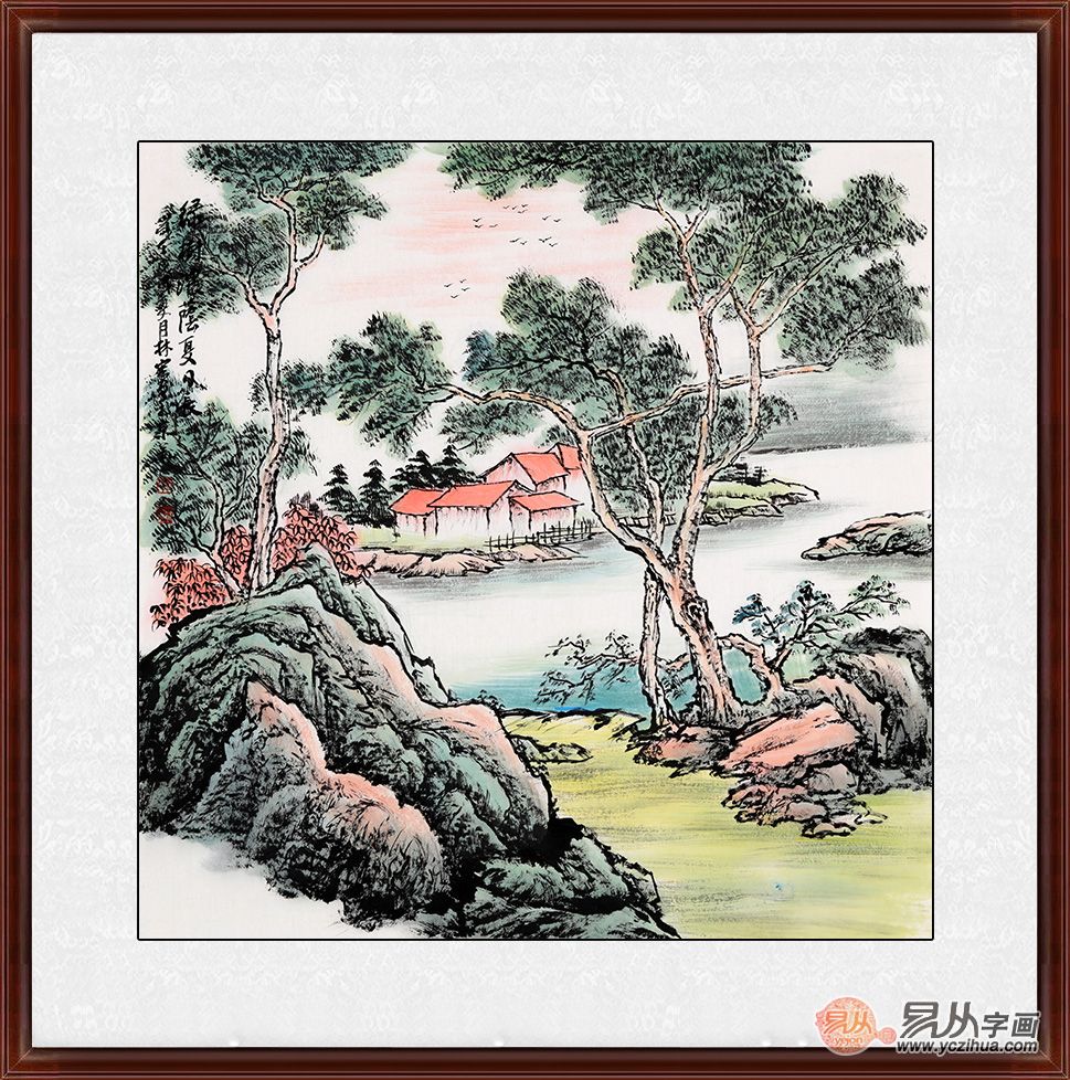 李林宏较新力作青绿斗方小品画《绿树浓荫夏日长》作品来源:易从网