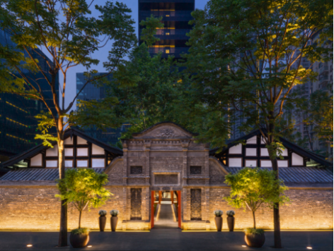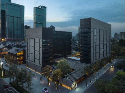 建筑群体的内侧外立面设计,则以温暖的香槟色为主色,并借鉴当地四合院的层进概念,将两栋全新的“L”型建筑之间的空间进行了规划。这些丰富、延绵感十足的四合院式的区域分割,将令身在其中的宾客们不自主地感觉仿若置身于巴蜀陡峭山坡上的梯田中。而在这层叠的院落之间,被巧妙设计的采光井,则使得自然光线可以充分地照射到集中了公共设施的建筑群的低层空间。