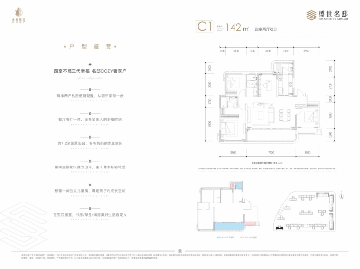 C1户型 142㎡四房:宽厅设计,270°观景阳台,定义轻奢生活