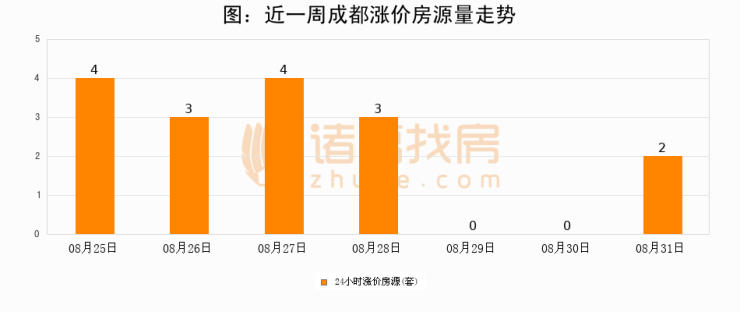 根据诸葛找房数据显示,成都24小时涨价房源量为2套,较08月30日增加2套,环比上涨0%。与此同时,涨价房源占比小幅扩大,业主信心有所提升。