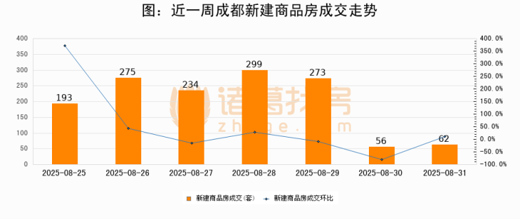 根据成都市住房和城乡建设局数据显示,2025年08月31日成都新建商品房成交62套,较昨日增加6套,环比上涨10.7%。近一周成都新建商品房日均成交199套。08月31日单日成交62套,低于近一周平均水平68.8%。