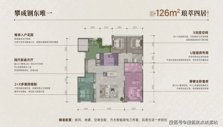 建面约126㎡璟萃户型(4室2厅3卫):客厅朝南,采光通风优越。配有较大的入户光厅,客餐厅面积约49㎡,空间感十足。主卧套房超25㎡,带独立卫生间和衣帽间。几个次卧面积都在10㎡左右,没有边角小房间的尴尬。对于二胎家庭或三代同堂来说,这个户型空间利用十分极致。