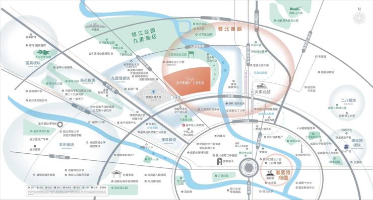 三纵一横路网(【三纵】交大路、九里堤路、蓉北商贸大道;【一横】二环);5条地铁线、多站点环伺(周边地铁站-的7号线九里堤站,6号线西南交大站,5号线赛云台站和北站西二路1号线火车北站,另有18号线火车北站在建),复合交通网保障高效出行。