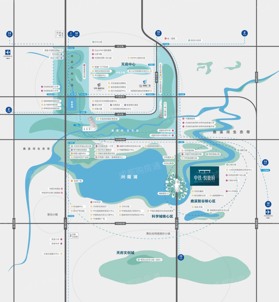 中铁悦鹿府位于天府新区兴隆湖岸鹿溪河畔,距离地铁18号线兴隆湖站直线距离约1600米。