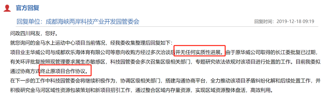 迄今为止,金马国际体育城并没有成功打出知名度,之前经济体量达到千亿的目标也未实现,甚至连较为重要的金马湖水上运动中心项目都烂尾了。不得不说,这是一个很大的遗憾,近几年成都在努力打造国际体育赛事名城,成功申办了大运会,如果水上运动中心不烂尾,或许还可以争取水上运动比赛、滑雪运动等赛场,以此来提升国际知名度,但现在也只能失之交臂。