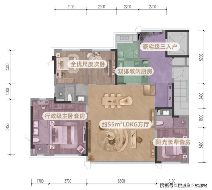 空间亮点:LDKG一体化设计,约55㎡墅级宽厅连接景观阳台,主卧含双台盆独立卫浴、双衣帽间及光合梳妆台,行政级奢居配置。