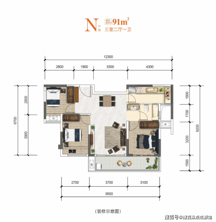 建筑面积约91㎡ |三室两厅一卫