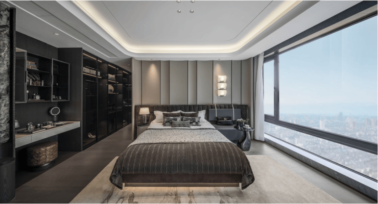 约40㎡主卧套房配备广角观景窗与双台盆系统,通过精心布局倡导恋人般亲密关系,为夫妻营造持续保鲜的居住体验。