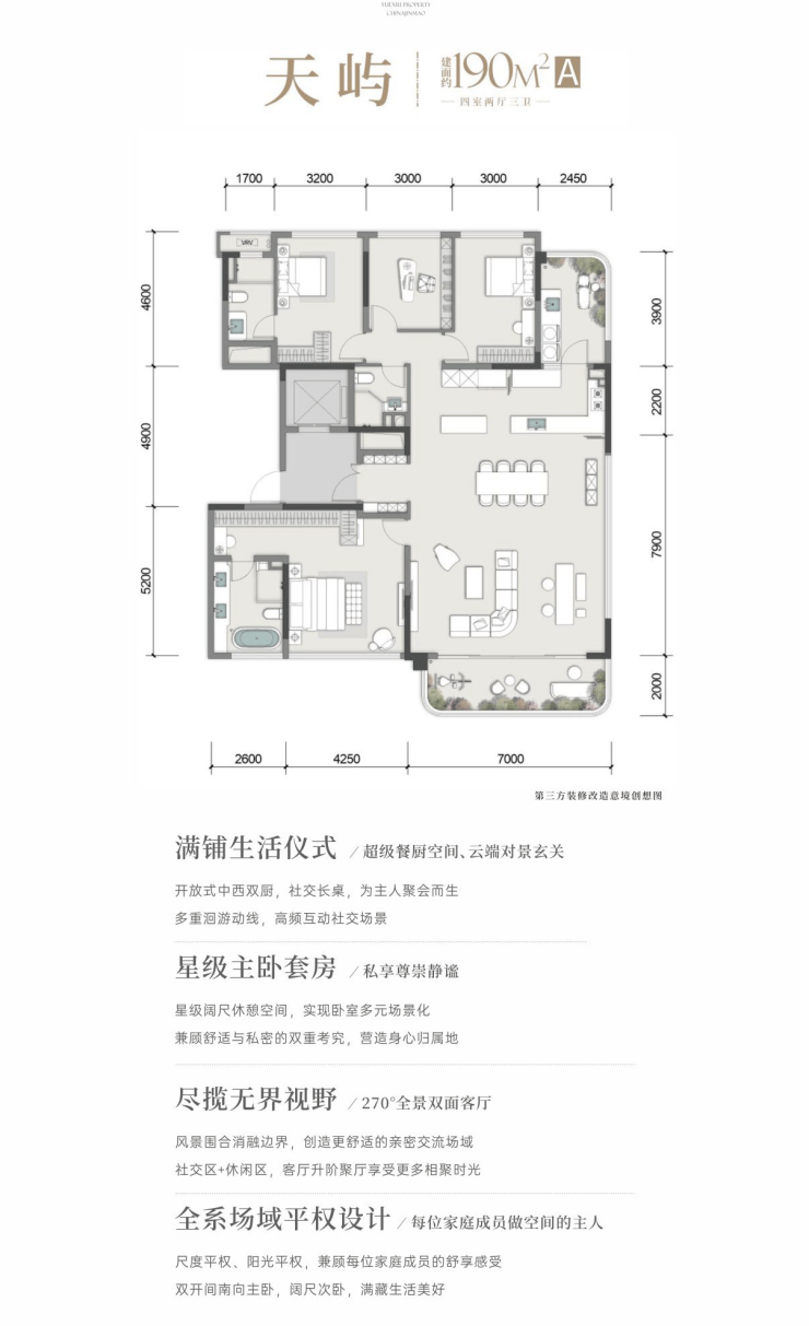 产品面积:190㎡天屿 四房两厅三卫/190㎡鹭屿 四房两厅三卫/143㎡漫屿 四房两厅双卫