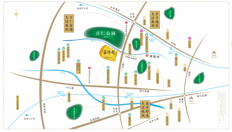 蓝光雍锦园位于西贵宝地金沙板块核心位置,青羊区西三环外侧,苏坡立交和羊犀立交之间,属于成都政府重点打造的百仁高端生态居住区,紧邻1770亩百仁生态公园(相当于4个浣花溪大小)。项目紧邻地铁27号线蜀鑫路站,预计年底开通。一街之隔便是超1700亩的百仁城市文化公园。项目属青八区,对口小学为花园国际小学清波校区,对口初中包括树德实验中学清波校区、泡桐树中学百仁分校。