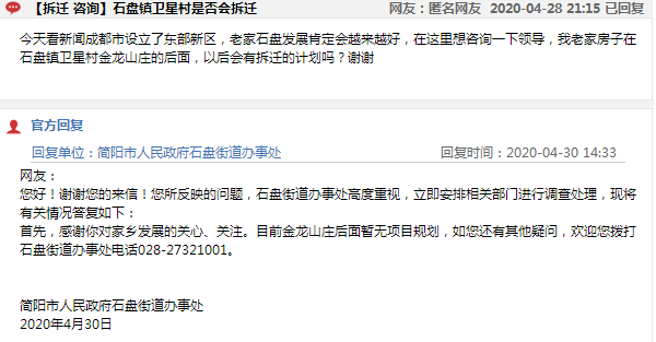 今天看新闻成都市设立了东部新区,老家石盘发展肯定会越来越好,在这里想咨询一下领导,我老家房子在石盘镇卫星村金龙山庄的后面,以后会有拆迁的计划吗?谢谢。