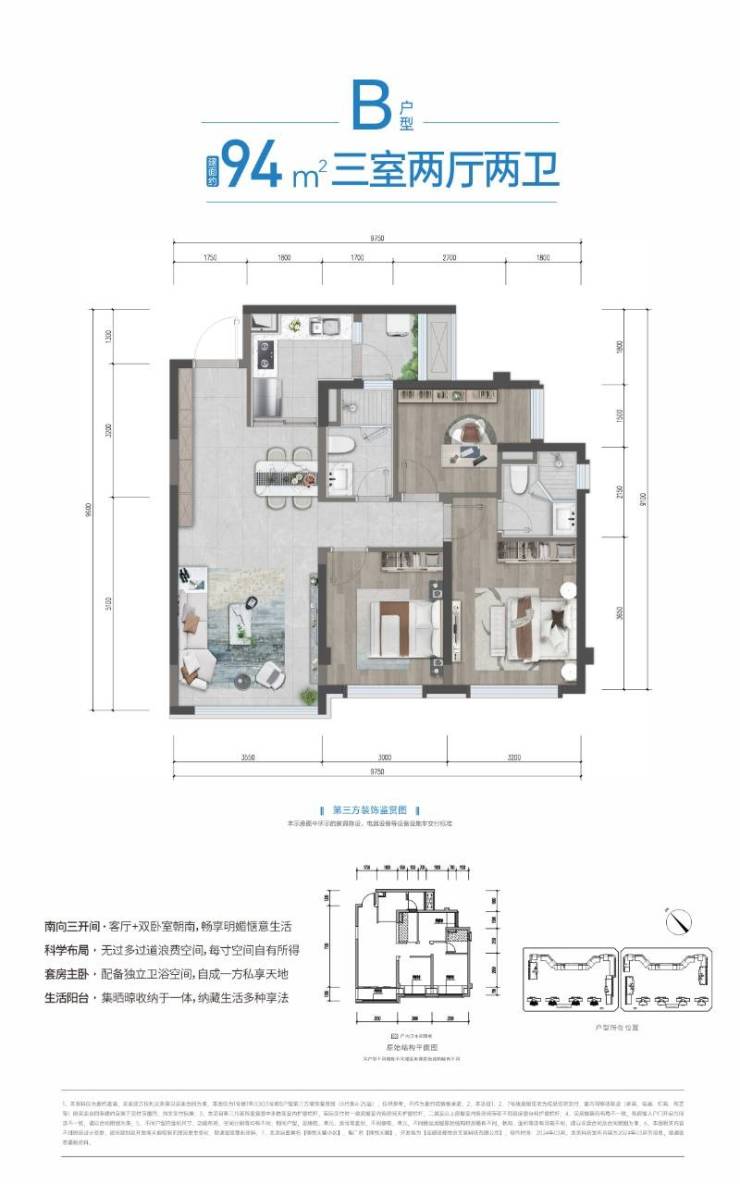 得房率:79%(含阳台及飘窗赠送,94㎡户型约7㎡,110㎡户型约9㎡)