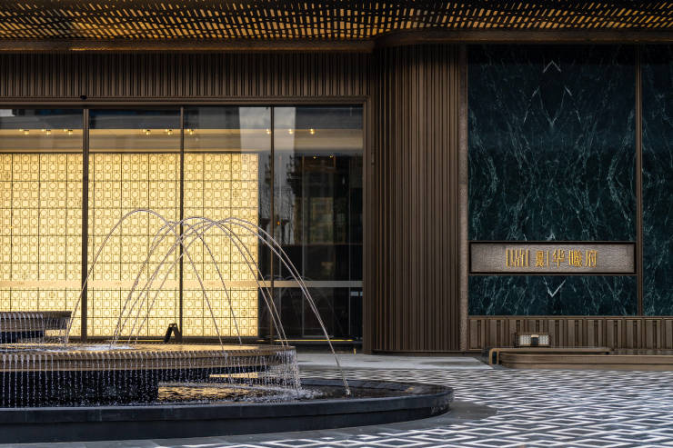 入院美学-深藏宁静与奢华;独立主题单元入户花园,设置双侧叠水溪景归家入户,运用现代科技水刀拼花雕刻古典川蜀纹样,入户门头采用石材和弧形玻璃精致交接,细节上处处体现华曦府对于美学艺术的追求。