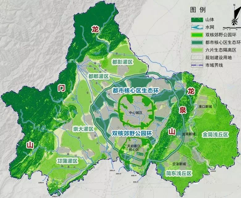 “东进”区域转变营城思路遵循“以人为本、生态优先、职住平衡”原则,合理确定人口规模、功能定位、城市边界、公共服务和建设导则,遵循TOD、EOD导向,合理布局产业功能区和城市街区,以轨道交通主导城市发展空间布局,通过绿环、绿廊、绿道等主导城市社区等功能布局,强调塑造人与城和谐共生的良好形态。坚持“世界眼光、国际标准、天府特色、高点定位”,在“精筑城、广聚人、强功能、兴产业”的发展思路下,成都要把东部新城塑造为“山水呼应、蓝绿相映、河湖环绕、清晰明亮”的美丽宜居公园城市示范区。其中有几个细节值得细细品味。一是“东进”区域强化“人-城-产”的发展模式这一逻辑中,“人“是核心。而按照规划,到2070年,“东进”区域的总人口将达到800万。这意味着,“东进”区域就将依照800万人口的规模将新城内的公共配套、公共服务用地规模进行“锁死”,而后随着人口规模和城市的发展再进行分步分批建设。这一做法的目的,是尽可能避免重蹈过去公共服务配套不足的覆辙。即便未来未达到极限人口,新城还是会因此而保持宜居。二是突出了城市族群发展借鉴新加坡城市“族群”理念,“东进”区域规划了“城市-片区-新镇-小区-组团”五级城市单元,不同的单元覆盖不同的人口规模,也承担不同能级的城市功能,其间通过三级绿道串联形成公园体系。其中,“新镇”“是一个值得关注的新概念,它将成为产城融合的基本单元,产业、居住、产业配套和居住配套都在这个单元中科学配置,以此减少跨区域的交通出行需求。三是在规划初期就强化“留白”不仅从整体上明确了2035年前不跨过沱江,主要在沱江以西地区发展,连每一个具体项目都充分考虑了未来发展的空间需要。为支撑东部新城未来公共服务和产业发展的新需要,规划了2处各2.5平方公里的城市级预留用地和8处各1平方公里的片区级预留用地。在招商引资过程中,也特备强调“战略留白”的发展思维,改变传统招商引资工作“只见项目不见产业”的局面,树立“有所为、有所不为”和“精准招商”的招引导向,引导产业在不同区域专业化集聚。
