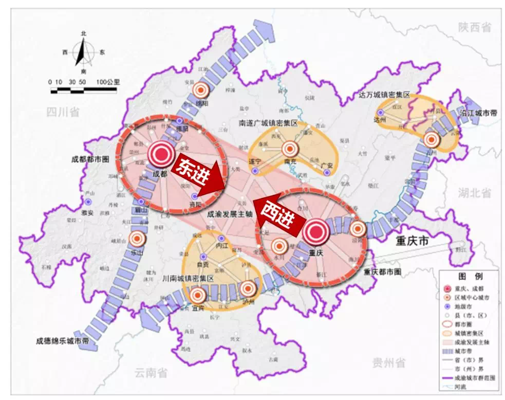 只有核心城市加速发展,才能加速城市群进程,形成区域带动作用,成都提速发展势在必行,而成都“东进”与重庆“西进”相呼应,有利于推进成渝城市群整体建设进程,加速成都-重庆形成“双核协同”发展格局,进一步加速成渝城市群的发展进程。图:成都“东进”和重庆“西进”