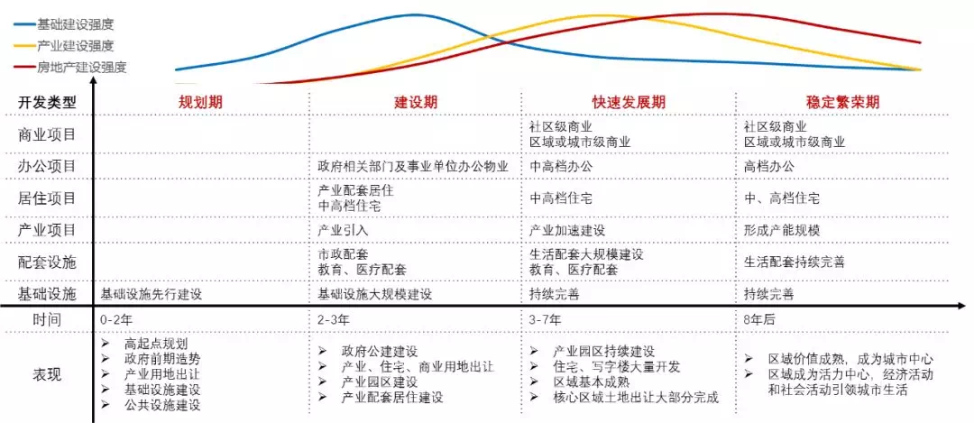按照城市新区发展理论模型,新区建设有着客观的进程,如果超越客观进程,急功近利,带来的将是损耗新区发展的未来潜力,扰乱新区发展的有序步骤。图:新区建设模型