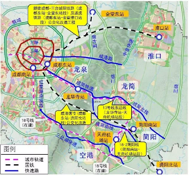 “三快”实施计划。城市东中州——东进大道(成简快速)工程于2017年开工建设,2019年建成通车;成渝门户景观大道——东盛大道(成洛路)、空港腾飞之路——东港大道(三岔湖快速)于2018年开工建设,2020年建成通车。 “三轨一支”实施计划。新建成都-三台城际铁路(清泉站-金堂东站段)及遂成铁路(成都东站-淮口站段)公交化改造工程、成渝客专(成都东站-资阳北站段)公交化改造工程,2017年启动前期工作,2020年完成;13号线东延线工程、18-2简阳线工程2017年启动前期工作,2018年开工建设,2022年建成运营。