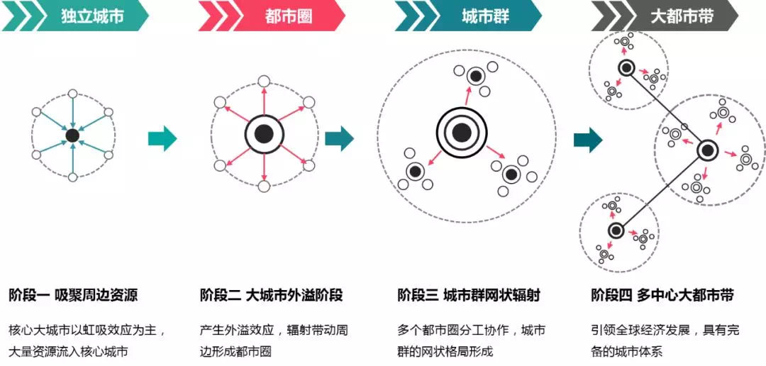 城市群是中国新型城镇化的主体形态,未来的生产力布局和新的经济增长点都将围绕城市群进行,而城市群的发展存在普遍性规律,发达国家的城市化一般都将经历“城市→都市圈→城市群”的过程,人口与资源不断向大城市和都市圈聚集。目前来看,长、珠三角已形成城市群结构,京津冀进入北京外溢的都市圈阶段,而成渝城市群仅核心城市经济规模较大,且处于快速发展期,尚未到辐射阶段。图:城市群发展阶段