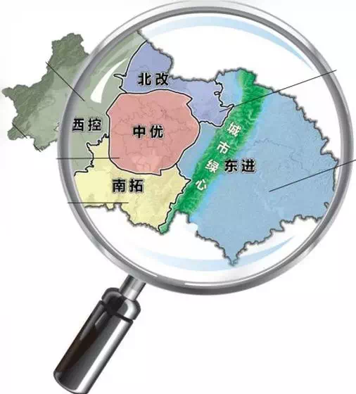 “两山夹一城”的地理格局是护城的摇篮,却也让工业化时代的资源约束、环保问题、人口密度问题更加凸显。过去十年,成都常住人口年均净增10万以上,中心城区的人口密度却在2014年就达到2万人/平方公里,远超很多人心目中最拥挤的东京。人口增多,伴随的是越来越严重的“大城市病“——交通越来越堵,市民对环境质量的抱怨越来越多,资源对产业发展的制约越来越大,“两山夹一城”的地理格局,从保护变为了束缚。2017年4月,成都市第十三次党代会提出建设全面体现新发展理念的国家中心城市,落实“东进、南拓、西控、北改、中优”等重大决策部署,打破城市圈层式发展格局,成都城市布局由原来的“两山夹一城”转变为“一山连两翼”,龙泉山由原来的生态屏障转变为城市绿心。重塑城市空间结构和产业经济地理,成都迎来千年之变。而“东进”区域,更是担负着开辟经济社会发展“第二主战场”的城市建设使命。图:成都“东进”区域