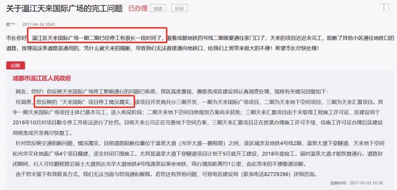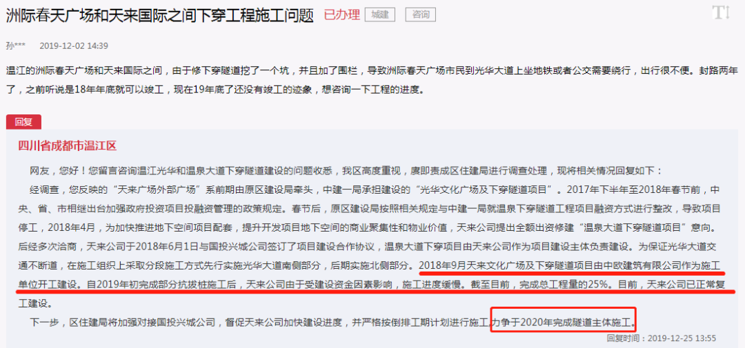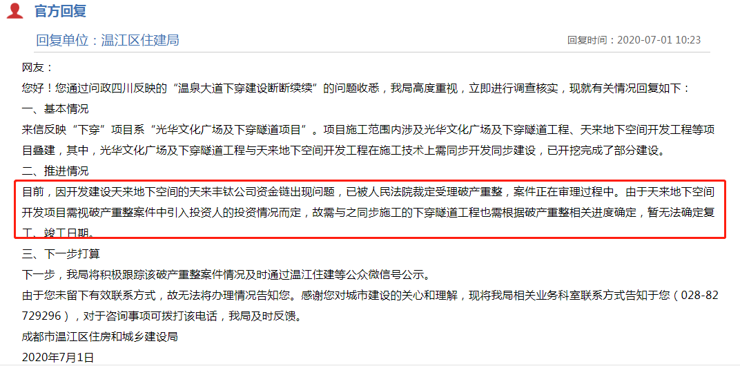 2020年7月初,温江区住建局回复表示:因开发建设天来地下空间的天来丰钛公司资金链出现问题,已被人民法院裁定受理破产重整,案件正在审理过程中。由于天来地下空间开发项目需视破产重整案件中引入投资人的投资情况而定,故需与之同步施工的下穿隧道工程也需根据破产重整相关进度确定,暂无法确定复工、竣工日期。