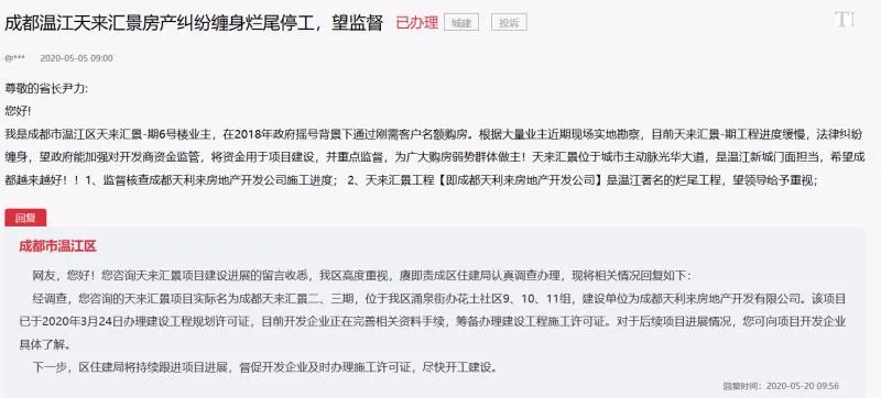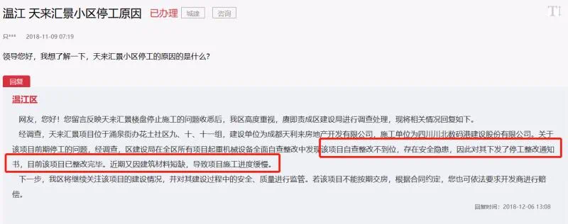 2019年9月,成都市温江区政府在一则回复中表示:天来汇景项目前期因住宅1、2、3号楼劳务公司与总包单位存在分歧,导致项目在2018年10月底时停工。经协商后,于2018年12月底恢复施工。2019年6月底该项目再次因工程款纠纷导致项目进度停滞。