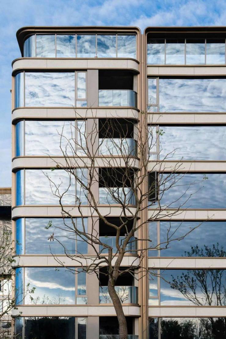 建筑立面运用大面积LOW-E玻璃幕墙系统,曲面玻璃与无横梃落地窗完美结合,将窗墙比推向极致。通透的曲面玻璃倒映天光云影,演绎建筑美学向居住美学的深度转化。