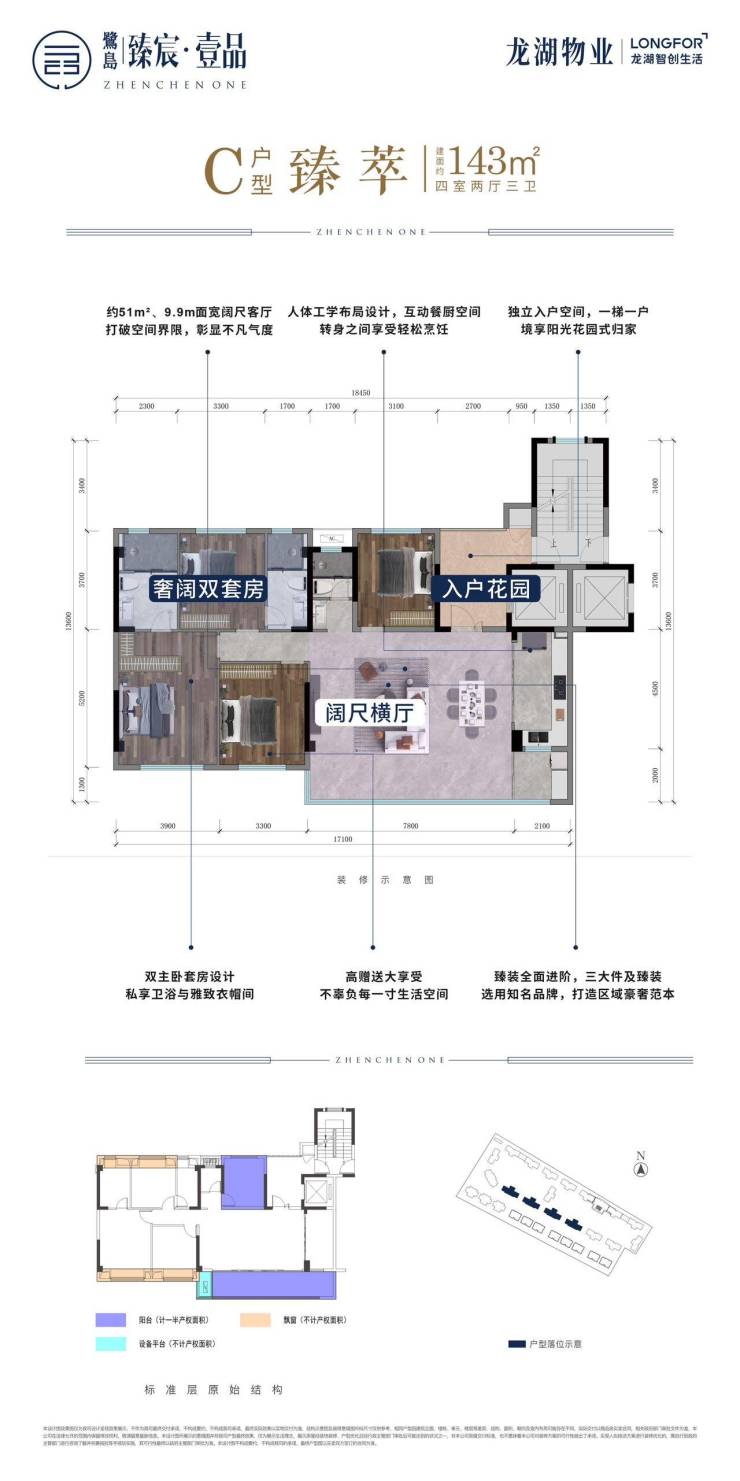 纯粹洋房——14-17层1T1纯板式;私梯入户——户户独享电梯私厅;顶尖户型——120%超高得房率;无忧精装——一键改造 拎包入住;高奢会所——唯一下沉会所