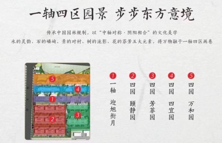 “锦御东府”传承中国传统园林的严肃规则,以“中轴对称 - 阴阳相合”的文化美学,打造“一轴四园、五重归家礼序”的风韵空间,步步东方意境。