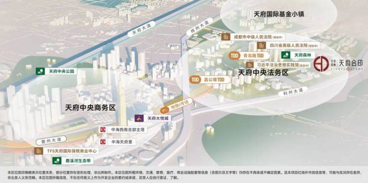 天投中海·天府合印,位于天府新区核芯天府前湾板块,紧邻现行天府商务区,且北接麓山、西连麓湖等高端板块,地理优势得天独厚。是天府新区核芯区城市规划的收官之作,参照上海前滩、杭州前湾先进经验,将形成“天府森林新绿窗”、“政法服务新高地”、“公园生活新社区”三大功能定位。