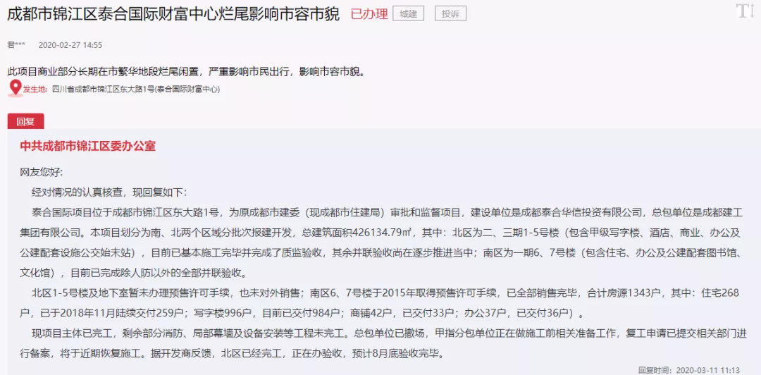 其中4号地块1号楼在2018年就已封顶,超过144米的2号楼也于2019年7月通过了竣工验收。