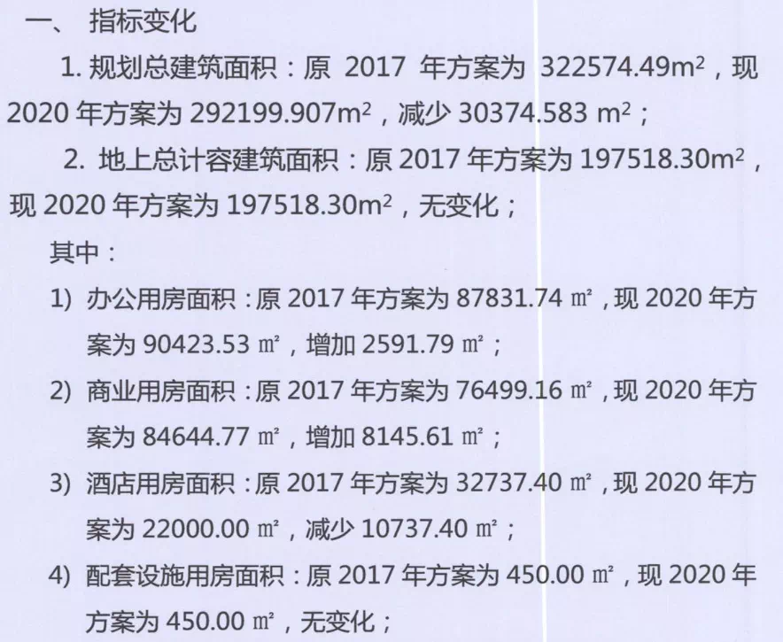 今年3月31日,项目建设方案调整公告发布。UP君注意到:虽然整体体量缩减,地上计容部分变化不大,主要减少了酒店用房面积,而商业、办公用房面积均有增加。