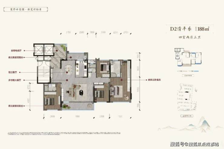 全明电梯厅,独立电梯类一梯一户私家入户,延伸入户格局;约5.8㎡独立收纳玄关;约8.8米寰幕阔景阳台,可欣赏宋风园林风光;约9米三位一体客餐厅,南北通透采光;星级主卧套房,南北通透,270° 转角开窗面,步入式全明衣帽间。