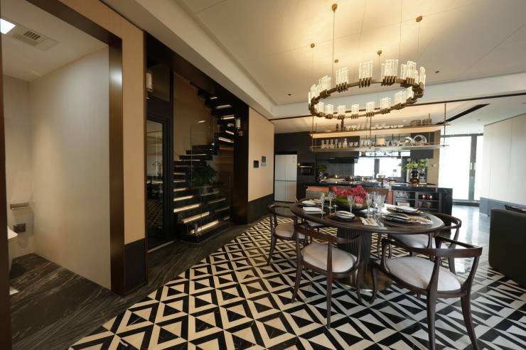 艺术美学空间:国际设计师团队操刀软装陈设,呈现美术馆级居住美学。采用意大利进口拼花石材铺就餐厅地面,搭配定制吧台系统,完美融合实用功能与艺术格调。