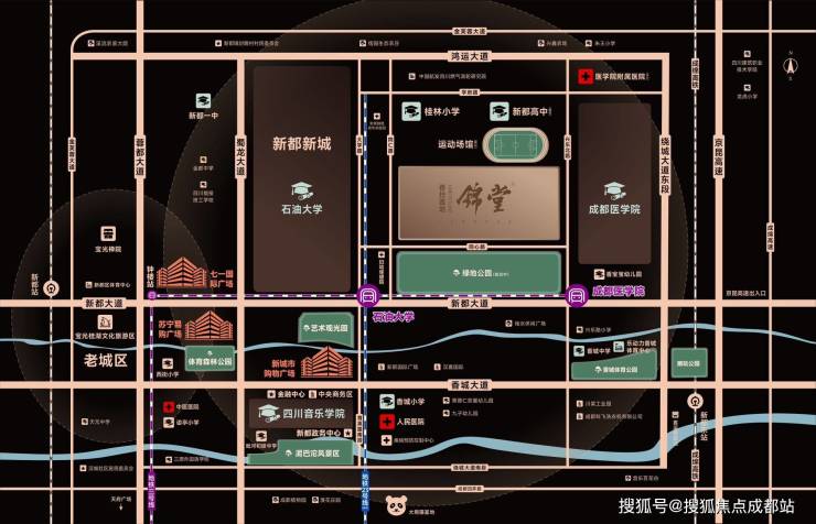 项目位于新都区同仁路与同心路交汇处,香城中心的核心区域,地处资源最丰富的区域,南侧为15亩绿地公园,北侧为医学院附属小学,西侧是西南石油大学,东侧为成都医学院。