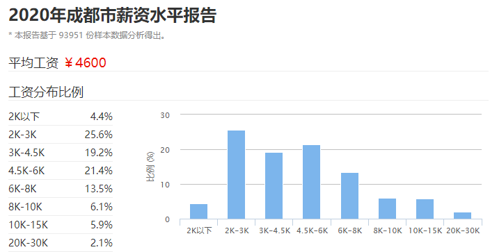在成都,工薪阶层的平均工资竟然只有4600元/月。从工资分布比例来看,月工资2000-3000元的人群占比最多,达到25.6%;月收入4500-6000元的也算主流,差不多有五分之一的人就是如此;而月薪高于10000元的人则凤毛麟角,总占比才8%。