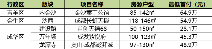 3、首付40-50万,可选的区域有:北大街、桐梓林、九眼桥、万年场、科华、高攀路、川音、花牌坊、神仙树、高升桥、新华公园、两河公园、成飞、外光华、顺江村、太平寺、外金沙、内金沙、国宾、羊西线、李家沱、八里庄、十里店、建设路、崔家店、东客站、外双楠等27个版块。