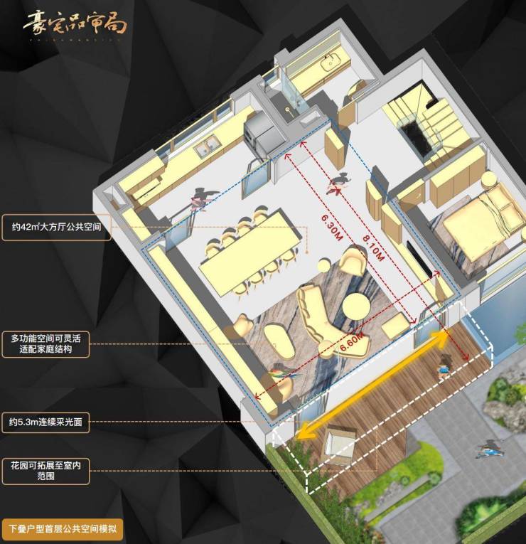 以建面约230㎡下叠户型为例,南向9.9m面宽,三开间朝南。三面宽是豪华级叠拼硬性要求。
